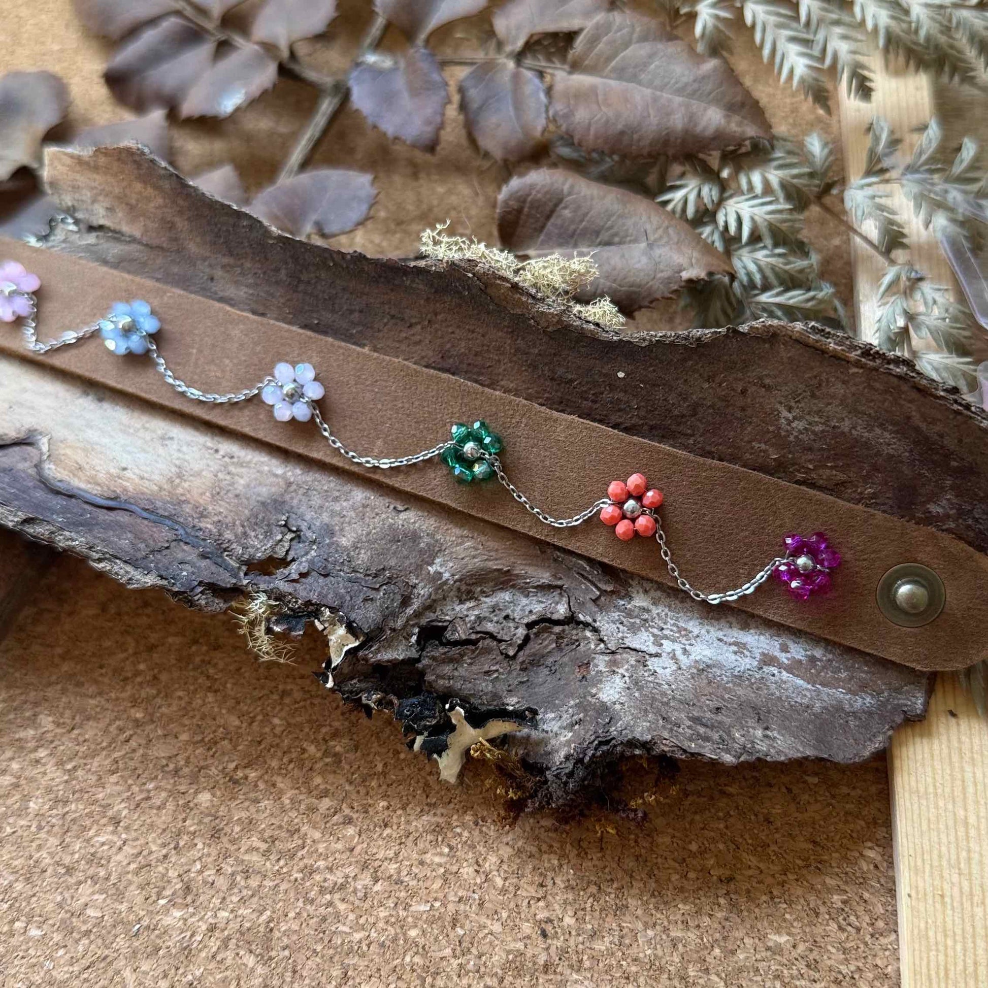 Esta pieza no utiliza resina ni flores naturales; su encanto proviene de la combinación artesanal entre lo textil, lo metálico y el color, creando una pulsera liviana, alegre y perfecta para complementar looks casuales o bohemios.